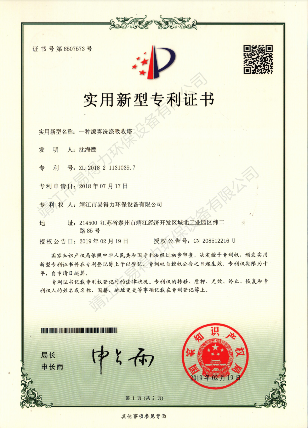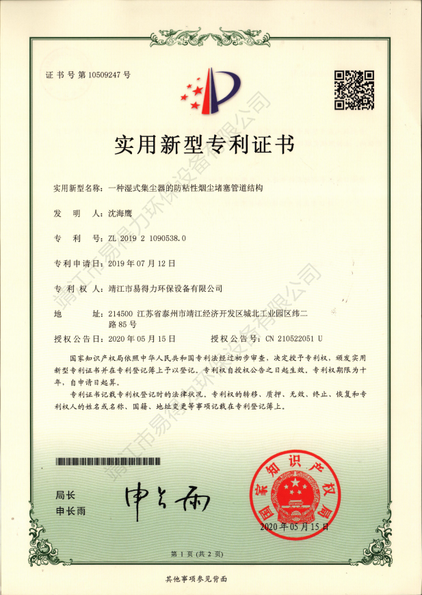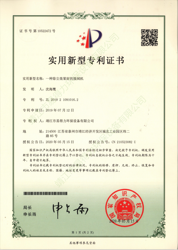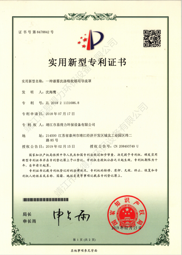 專利證書本公司坐落于開放開發(fā)超前城市江蘇靖江,我們精良優(yōu)秀設(shè)計團隊始終遵循著創(chuàng)新超越的理念,贏得了中外合資企業(yè)的信賴。易得力環(huán)保設(shè)備有限公司與上海環(huán)科院等科研單位保持合作關(guān)系,不斷加大自身的科研力量,集中了一批國內(nèi)環(huán)境科技研究和應(yīng)用方面的高素質(zhì)人才,取得多項實用新型專利證書。…… 查看更多 >>